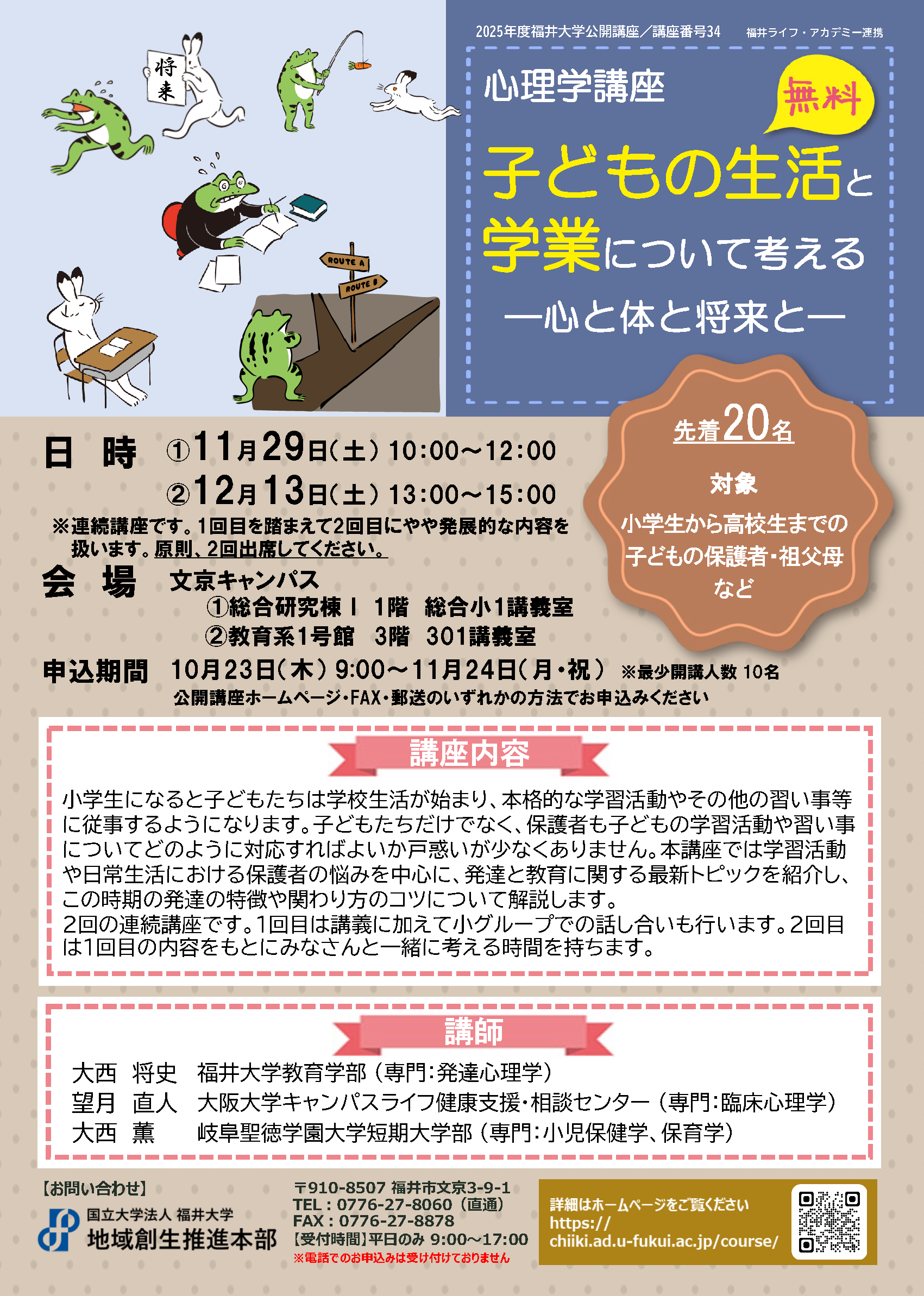 【講座番号34】心理学講座「子どもの生活と学業について考える -心と体と将来と-」(2回連続講座)