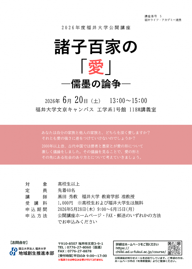 | 受講料 | 1,000円 ※高校生および福井大学生(院生含む)は無料 |